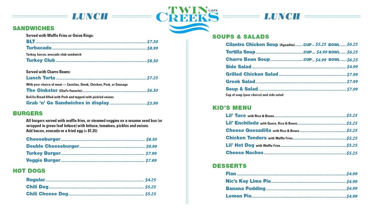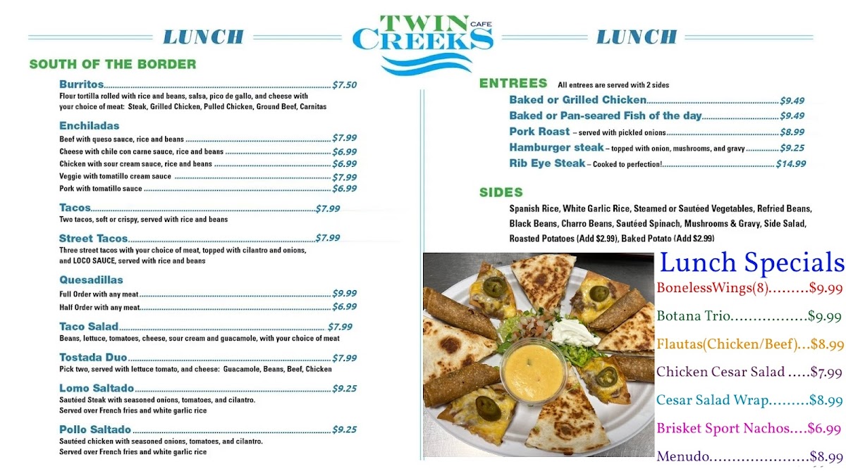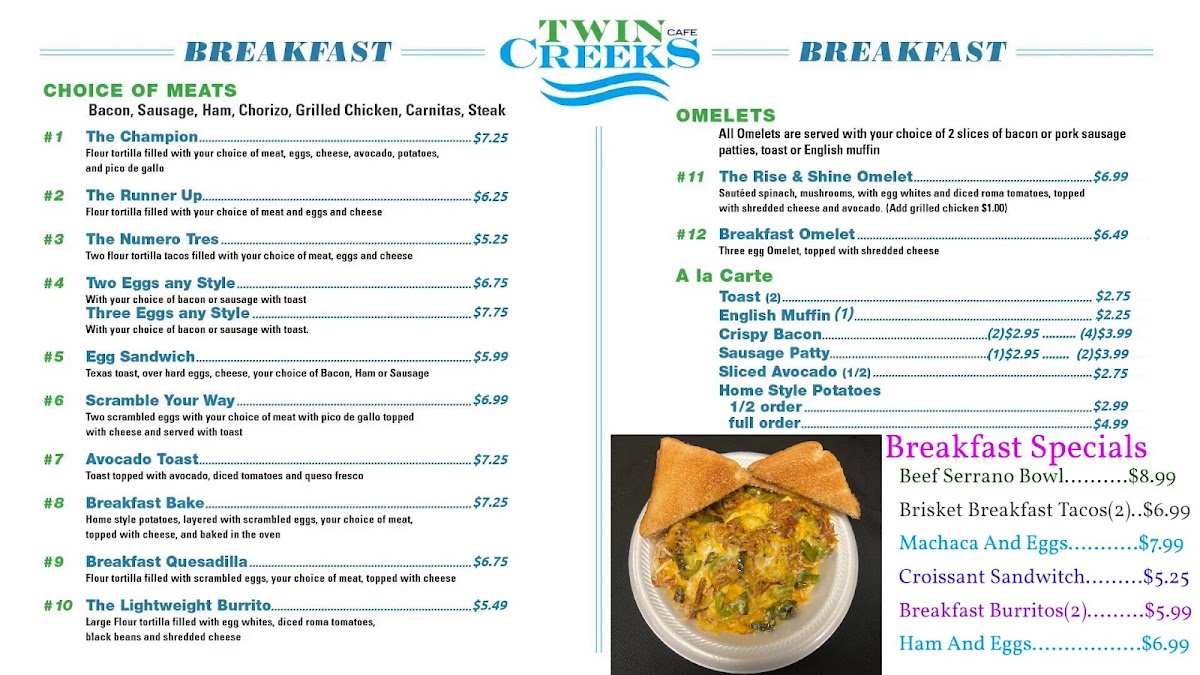 Located in the heart of Fort Worth, TX, Twin Creeks Cafe Menu offers a delightful mix of comforting classics and local favorites that are perfect for any occasion. Whether you're in the mood for a hearty breakfast to start your day or a light lunch with friends, you'll find something to satisfy your cravings. The menu features a range of options, from fresh salads and sandwiches to indulgent comfort foods that are sure to hit the spot. For those with a sweet tooth, the cafe's desserts are a must-try, offering a perfect end to your meal. With its cozy atmosphere and friendly service, Twin Creeks Cafe is the perfect place to relax and enjoy a delicious meal with loved ones.